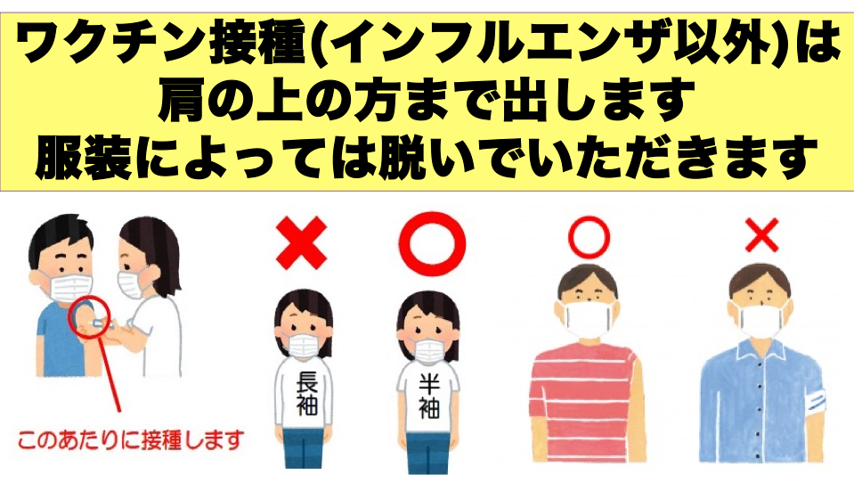 - アルコール消毒禁忌の方は受付時に申し出て下さい。